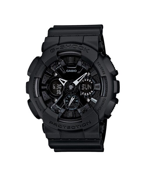 Blacked-out resin encases a sporty, oversized watch boasting digital and analog time on the LED-illuminated dial. World time, daily alarms, stopwatch and calendar displays provide a variety of useful features, all protected by shock- and water-resistance. 55mm case; 30mm band width. Buckle closure. Push-activated LED backlight. Water-resistant to 20 ATM (200 meters). Mineral crystal face. Resin. By G-Shock; imported.