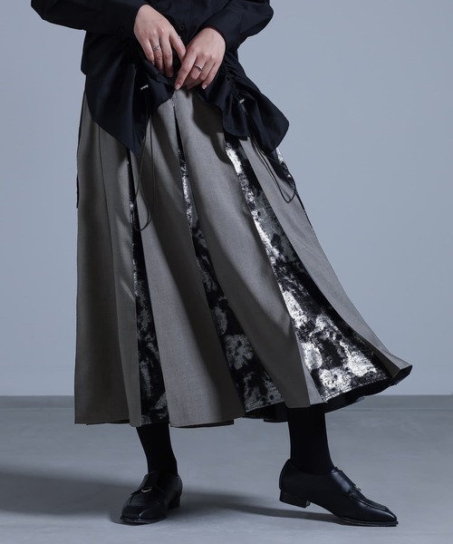 ■デザイン 動く度にニュアンス柄の箔プリントがチラ見えする、ひとクセあるフレアスカート。マチを取って箔が見えすぎないようにし、着やすさも兼ね揃えるデザインです。後ろファスナーには長めの共地テープを付け、ポイントにしました。 ■コーディネート トップスは無地のシンプルなアイテムを合わせるだけで、スカートのデザインが引き立ちモードな印象に。デザインシャツなどはもちろん、ラフなスウェットと合わせてバランスを取るのもおすすめです。足元はショートブーツやローファーと合わせてクールに決めたり、スニーカーでカジュアルに外しても◎ ■素材 スーツ生地は、程よい厚みでキレイめな印象の素材感。二色で柄になったニュアンスのある箔生地は、高級感のある軽めの生地感。さらっとした裏地付きで、安心してご着用いただけます。