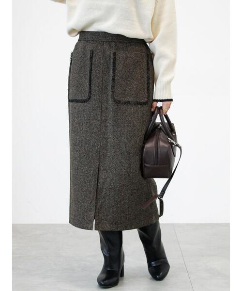 フリンジで縁取られたポケットデザインがポイントになったスカート。上品な印象を与えてくれるツイード生地で仕立てられており、大人の女性らしい着こなしを演出してくれます。センタースリット入りで足元に軽やかな抜け感をプラス。カジュアルにはもちろんオフィスやデートシーンにも活躍してくれるアイテムです。※商品画像は、撮影環境やお客様のご利用のPC・スマートフォンのモニター環境などにより実物と色味に差異がある場合がございます。【その他採寸】F ウエスト:[後ゴム仕様]64cm