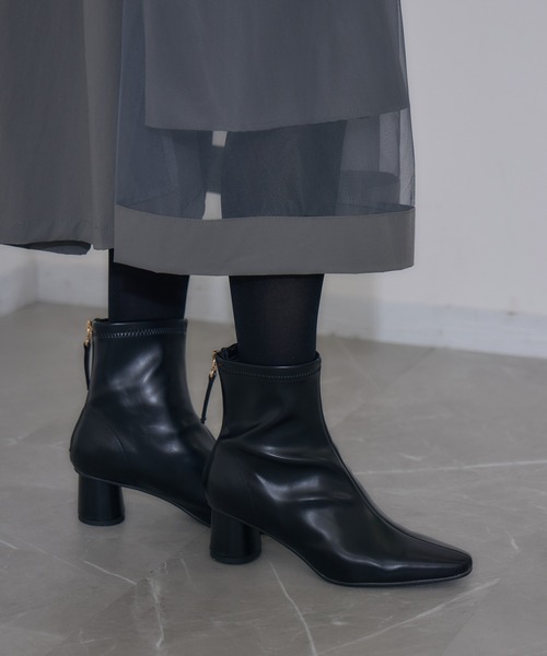 サークルヒールが今っぽい、エレガントな定番ショートブーツ<POINT>シャープなスクエアトゥとサークルヒールでエッジの効いたショートブーツ。バックファスナーのゴールド金具もアクセント。プレーンな印象でどんなスタイリングにも馴染みます。【素材感】微光沢な合成皮革が上品でエレガントな印象。【デザイン・シルエット】スッキリとしたシャープなシルエットで定番的なデザインです。かかと部分にファスナーが付いて脱着もしやすい。円柱形のサークルヒールがモードな印象です。【カラー】ブラック の1色展開。【スタイリング】定番的なデザインでパンツ、スカート選ばずに履いていただけます。高すぎなく、安定感のあるヒールでデイリーに使いやすく、1足あると便利なブーツです。---------------------------------------------------●お気に入り登録でお得情報を手に入れよう!「商品のお気に入り登録」をすると、再入荷通知や、ラスト1点の通知、セールの通知など、お得情報が届きます。また、マイページでいつでも確認が可能になります。「ブランドのお気に入り登録」をすると、新商品や再入荷、などいち早くブランドの最新情報をお届けします。ぜひ、ご利用ください。----------------------------------------------------