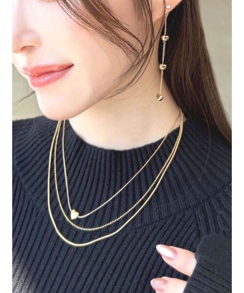 形の異なるチェーンを3種類使用したネックレス。 真ん中には小さくハートのモチーフをあしらい今年らしいデザインに。 ネックレス一つで首元を華やかに彩ってくれます。