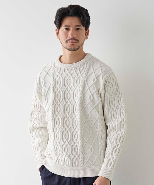 アランニットやフィッシャーマンニットをモチーフにし立体的に編まれた網目模様が特徴のケーブルニット。 見た目に重厚感がありながら、膨らみのある柔らかなポリエステル糸を使用することにより、軽く現代風に仕上げました。 カラーリングは重くなり過ぎないようMIX調に表現しております。 【デザイン/スタイリング】 本格的なケーブル編みが、シーズンムードを高めてくれる長袖プルオーバーニット。トラッドな印象のあるアランニットをモダンなシルエットに変更し、トレンド感溢れるアイテムにアップデート。まさに旬な着こなしを楽しんでいただける1着です。 【UNION STATION/ ユニオンステーション】 「さりげない上品さ」をキーワードに大人に向けた、素材感と着心地にこだわったアイテムを展開。 肩ひじを張らずに自分に合ったおしゃれを楽しめる、きれいめスタイルを提案します。 私たちは服を通してみなさまの心が明るくなったりワクワクしたり、ささやかな高揚感を感じていただけるような”おしゃれ着”をお届けします。 ※屋外での撮影画像は光の加減で、実際の商品より明るく見える場合が御座います。商品の色味は生地アップ・スタジオ撮影の画像をご参考下さい。 ※画像の商品はサンプルとなりますので実際の商品と仕様、加工、サイズが若干異なる場合がございます。 ※ご注文いただいた予約商品のお届け時期の確認は、注文履歴ページより行えます。