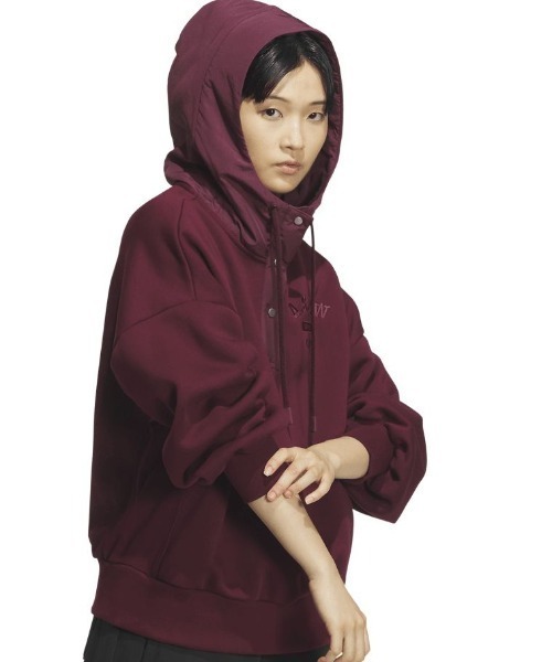 """トレンドのオーセンティックなカレッジルックとスポーティーをミックスしたCOLLEGIATEレンジ。新規裏起毛フレンチテリーを採用し、軽くバルキーで肌触り良い冬の定番素材。フードと前立てにはプレインウィーブと中綿を入れた、異素材ミックスを採用することで、他のフーディーと差別化。フードを軽く仕上げることで着用感の向上。左胸には刺繍でADIDAS SPORTSWEARを意味する""""A.S.P.W""""とアディダスが誕生した""""1949""""年を意味するグラフィックを採用。袖は少し袖口にかけてパフ感を出し、脇・袖口・裾にはクオリティーの高いリブを採用、縫製も3本針フラットロックステッチを採用し細部にこだわり。シルエットはルースフィット、少し着丈の長いミッドレギュラーレングス。"""