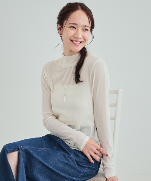 【デザイン】レイヤードスタイルにおすすめのハイネックトップス。体に張り付き過ぎない、見えるインナーとしてちょうどよいサイズ感にしています。素材の表面にストライプ状の凹凸があり、軽さを残しつつも透け感軽減。シンプルなコーデにアクセントをプラスすることができます。【スタイリング】形自体ベーシックなので組みあわせしやすくとても便利なアイテムです。インナーにタンクトップを着てレイヤードし、カーディガンを羽織ったり、スウェットやニットを上にきて、衿を見せる重ね着もおすすめです。キャミワンピやジャンドレ、ベストのインナーにも最適です。【素材】凹凸のストライプが特徴のチュール素材を使用しています。※照明の関係により、実際よりも色味が違って見える場合があります。また、パソコン・スマートフォンなどの環境により、若干製品と画像のカラーが異なる場合もございます。モデル情報:身長163cm B81 W59 H88 着用サイズ:02(M)店舗へのお問い合わせ商品番号:C62-19075●製品寸法:01(S):着丈57cm B80cm 袖丈57cm 肩幅34cm02(M):着丈59cm B84cm 袖丈58cm 肩幅35cm03(L):着丈61cm B88cm 袖丈59cm 肩幅36cm04(LL):着丈64cm B92cm 袖丈60cm 肩幅37cm備考: