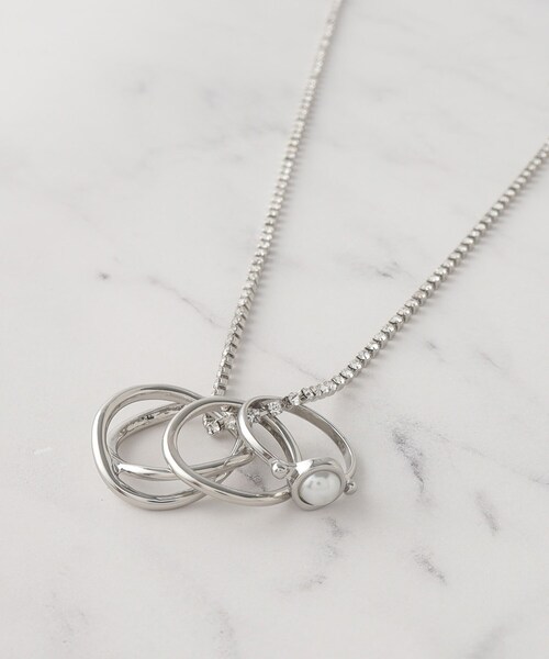 キラキラ輝くチェーンが魅力の3種リングモチーフネックレス 【デザイン】 キラキラのチェーンに、3種類の異なるリングモチーフが重なり合うデザイン。 各リングには独自のテクスチャが施され、視覚的な遊び心を演出しています。 シンプルながらも個性的な仕上がりで、洗練された印象を与えます。 モチーフは簡単に取り外せ、リング単体としても使用可能。 これにより、スタイルに合わせた多様な使い方が楽しめます。 ※照明の関係により、実際よりも色味が違って見える場合があります。また、パソコン・スマートフォンなどの環境により、若干製品と画像のカラーが異なる場合もございます。 店舗へのお問い合わせ商品番号:C70-89032 ●製品寸法: 00:全長74cm モチーフH2.6cm モチーフW2.4cm 備考: