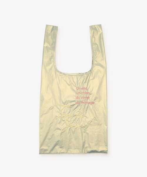 毎日の生活に寄り添う、汎用性に優れたショッピングバッグです。 パール感のある生地に、配色の刺繍でアクセントを効かせました。ベーシックなレジ袋型で、お買い物に使いやすいMサイズです。ハンドルを長めに設定しており、手持ちはもちろん肩掛けスタイルでも楽しめます。輪っかが付いているので、フックなどに引っかけて保管できるのもうれしいところ。使わないときはコンパクトに畳んで、バッグの中でもかさばらずに持ち運びが可能です。収納袋が本体と一体型になっているため、袋を無くす心配もありません。お仕事帰りの買い物やお出かけ先で荷物が増えたときにも役立ちますよ。 刺繍加工の特性上、裏側に台紙が残っている場合がありますが、使用や洗濯を繰り返すうちに徐々になくなっていきます。 *1点ごとに柄の出方が違うことがあります。 *【本体】縦36cm/横29.5cm/持ち手57cm/重さ54g *【収納時】縦11cm/横11.5cm/厚み2cm