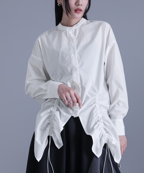 ■デザイン 身頃のドロストで自由にシルエットを変えられる変形デザインシャツ。ドロストの位置を左右でアシンメトリーにしたり、バックにもドロストを施したり、深めのサイドスリットを入れたりと、どこから見ても表情のあるモードな一着に仕上げました。ドロストを全て下げて、ロングシャツとしても使いやすいデザインです。 ■コーディネート 無地生地なので、シンプルなボトムスはもちろん柄物とも好相性。バンドカラーでニットなどのレイヤードも楽しめる、スタイリングの幅が広がるアイテムです。 ■素材 さらっとした肌触りの良いシャツ生地。コットン混で心地良く着用して頂けます。
