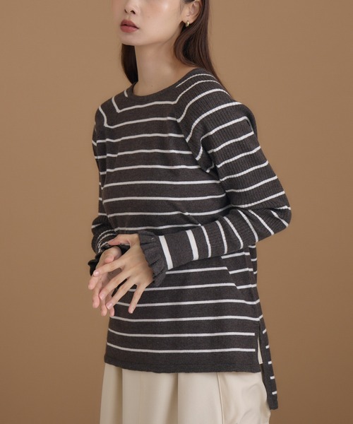 【KATHARINE ROSSオリジナル】今すぐ一枚で、冬はインナーとして、長く活躍できるボーダーニット[素材]・柔らかい糸で編んだハイゲージのニットなので、オフィススタイルにもおすすめなきれいめ素材。・もっちりとした着心地と体のラインをひろいすぎない適度な肉感です。[デザイン]・身頃は天竺編み、お袖はリブ編みにし、編地の変化を楽しむボーダーニット。・袖先がフリルになっていて、程よくフェミニンさをプラス。・後ろ丈を長めに設定しているのでパンツ合わせでもヒップ回りをカバーしてくれます。・二の腕周りはややゆとりのあるサイジングに、手首にかけてキュッと絞ったメリハリのあるお袖になっているので、気になる部分をカバーしながら腕を細く見せてくれるデザインです◎[スタイリング]・お袖をかるくプッシュアップすることで洒落感のある違った印象に。・タックパンツと合わせたマニッシュなスタイルや、ジャンドレやジレのインナーとして合わせたレイヤードスタイルなど幅広い着こなしをお楽しみいただけます。■光沢感:なし■透け感:なし■伸縮性:あり■生地の厚さ:普通生産の都合上、お届け時期が前後する場合がございます。システムの都合上、店舗より入荷が遅れる場合がございます。照明や光の当たり具合で色味が違って見える場合があります。24AW Collection24Autumn&Winter【お買い物をよりお楽しみいただくために】・商品のお気に入り登録をおすすめします!♡マーククリックで登録できます。完売カラーの再入荷や、ラスト1点になったときの通知、セールの際に通知などお得な情報を受けることができます。・ブランドのお気に入り登録もご一緒にお願いいたします!新商品や再入荷、などいち早くブランドの最新情報をお届けします。