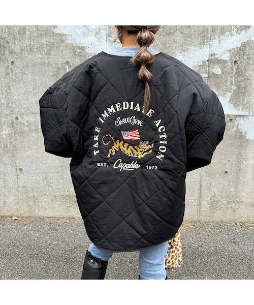 大胆に施された刺繍がアクセントのタイガー刺繍キルティングコート。 襟はすっきりとしたノーカラーで、パイピング始末を採用しデザイン性ある1枚。 両ポケット付きで機能性も◎ ゆったりとした絶妙なルーズさで、着こなすだけでトレンド感のあるコーデが完成します◎ ※モデル身長:161cm ■カラー ブラック ▪️サイズ L 身丈:75cm 身幅:67cm 肩幅:63cm 袖丈:51cm ※多少の誤差は予めご了承ください。 ▪️素材 表面ナイロン100% 裏地ポリエステル100%