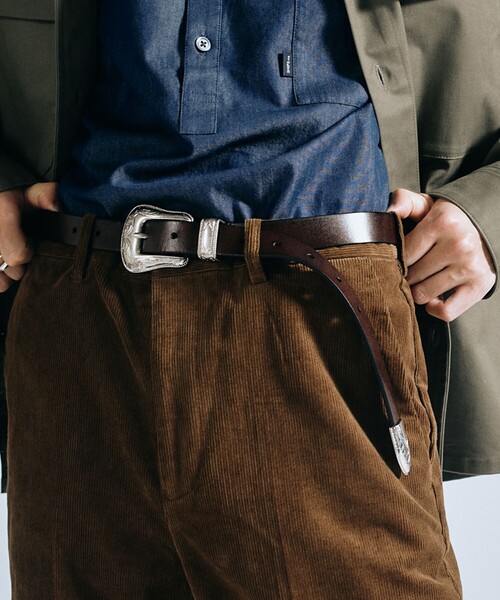 サイズ選び不要のワンサイズフィット!1本で幅広くサイズをカバーするウエスタンベルト牛革を使用したウエスタンベルト。少しボリュームのあるシルバーのバックルがポイント。タックインスタイルにはマストなアイテムで、ベルトの先を垂らしてスタイリングのアクセントに。通常のベルトに比べ穴を倍の10個に変更しており、女性から男性までOne Size Fits Allでご使用いただけます。【注意事項】※生産状況により店舗にて販売する場合もございます。※末永く愛用頂く為に、アテンションタグ・洗濯ネームを必ずご確認の上、着用又はお取り扱いください。※画像の商品はサンプルです。実際の商品と仕様、加工、サイズが若干異なる場合がございます。※撮影環境による光の当たり具合やパソコンなどの閲覧環境によって、実際の色味と異なって見える場合があります。あらかじめご了承ください。商品の色味は商品単体で撮影した画像をご参照ください。