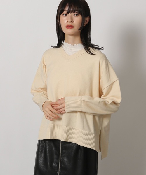 ハイゲージのニットトップスは、ドロップショルダーに身幅にゆとりもあるオーバーシルエットの1枚。すっきりとしたVネックはデコルテを綺麗に見せてくれ、インナー合わせをしやすいのもポイント。前後差のある着丈にサイドスリットも入っているので締め付けもなく、ラフな着心地も魅力です。【素材】柔らかく滑らかで肌触りの良いニット素材。薄すぎないしっかりとした生地感。【スタイリング】ゆったりとしたシルエットなのでナロースカートとの相性〇カジュアルなデニムと合わせたシンプルなスタイルにもマッチします。