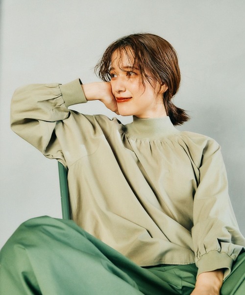 シンプルだけどサマになる! どんなボトムスとも合わせやすいブラウス ーーー 【素材】 ふんわりと柔らかな綿レーヨン素材を使用。 襟ぐりのリブはチクチクしにくい素材です。 【デザイン】 フレアシルエットのモックネックギャザーブラウス。 襟ぐりは着用しやすいリブ仕様で、ハイネックになりすぎないように調整しています。 袖口のリブはカジュアルな印象にしつつ、たくし上げやすいので動きやすさも◎ 身頃の襟ぐりや袖口にふんだんに入ったギャザーが今年らしく、一枚でサマになるブラウスです♪ ーーー 【スタイリング】 裾が広がっているので、カジュアルなデニムやワイドパンツとのコーデがおすすめ☆ ナロースカートなど大人な雰囲気のボトムとも好相性です! ニットのインナーにも◎