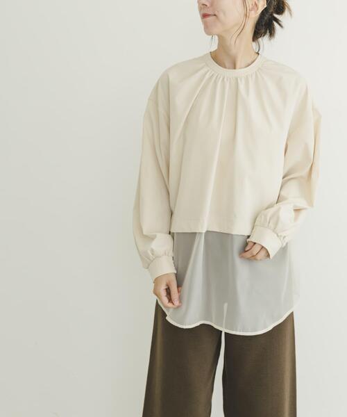 滑らかな生地と透け感のあるシアー生地をドッキングさせた切替デザインがポイントのブラウス。前後どちらを前にしても着用できる2WAYタイプなので、スタイリングやお好みに合わせて着方に変化をつけられるのが魅力◎ニットを重ねて裾からシアー生地をチラッと覗かせるコーディネートもオススメです。 【2024 Autumn/Winter】【24AW】 ※商品画像は、光の当たり具合やパソコンなどの閲覧環境により、実際の色味と異なって見える場合がございます。予めご了承ください。 ※商品の色味の目安は、商品単体の画像をご参照ください。 ▼お気に入り登録のおすすめ▼ お気に入り登録商品は、マイページにて現在の価格情報や在庫状況の確認が可能です。 お買い物リストの管理に是非ご利用ください。 素材感 透け感 : あり(シアー部分のみ) 伸縮性 : なし 裏地 : なし 光沢 : ややあり ポケット : なし FREE