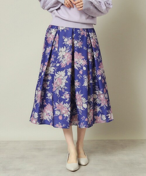 【デザイン】 コーディネートの主役になる華やかなシャンタンスカート。 秋冬のコーディネートにマッチする重厚感のあるカラーリング。 光沢感とスラブ調の表面感、適度なハリ感が特徴のシャンタン素材を使用したタックスカート。 華やかさのある大花のデザインに、秋冬のコーディネートにマッチするシックな色遣いでコーディネートの主役になるアイテム。 重厚感のあるカーラーリングなので足元がブーツになる時期にも相性ピッタリ。 定番のウエストタックデザインは腰周りをさり気なくカバーしてくれる優秀シルエット。 トップスINでも身体のラインを気にせずに着やすいアイテムです。 【素材】 スラブ調の表面感と適度なハリ感が特徴のポリエステルシャンタン素材。 【仕様】 ・ポケットなし ・裏地あり ・ウエスト後ろゴム ※照明の関係により、実際よりも色味が違って見える場合があります。また、パソコン・スマートフォンなどの環境により、若干製品と画像のカラーが異なる場合もございます。 モデル情報:身長166cm B80 W59 H85 着用サイズ:00(フリーサイズ) 店舗へのお問い合わせ商品番号:P93-69512 ●製品寸法: 00(フリーサイズ):W62~66cm H100cm 総丈78cm 備考: