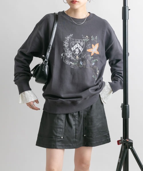 【クラシックな刺繍×古着ライクな主役級スウェット】 クラシックなクロス刺繍をフロントに施した主役級トップスが登場。古着のようなスウェットで、身体のラインを拾い過ぎないメンズライクなサイズ感もポイントです。着心地の良い綿素材も魅力的。カジュアルアイテムはもちろん、甘めテイストなボトムとも相性抜群。どんなスタイリングにも合わせやすいTOP GRAYとCHARCOALをご用意しました。 COORDINATE そのまま1枚で着るのはもちろん、レーストップスやタートルをレイヤードしたスタイリングもこなれ感が増します。思い切ってミニ丈ボトムを合わせたり、キャミワンピースの上から重ねたり様々な着こなしを楽しめます。 【2024 Autumn/Winter】【24AW】 ※商品画像は、光の当たり具合やパソコンなどの閲覧環境により、実際の色味と異なって見える場合がございます。予めご了承ください。 ※商品の色味の目安は、商品単体の画像をご参照ください。 ▼お気に入り登録のおすすめ▼ お気に入り登録商品は、マイページにて現在の価格情報や在庫状況の確認が可能です。 お買い物リストの管理に是非ご利用下さい。 素材感 透け感 : なし 伸縮性 : ややあり 裏地 : なし 光沢 : なし ポケット : なし One
