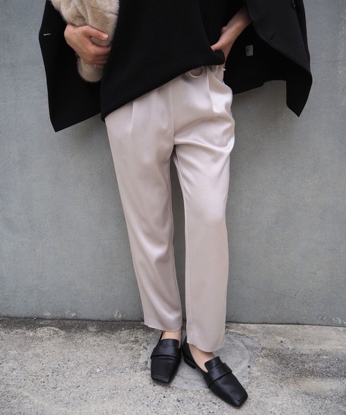 大人のこなれ感を演出できるパンツ*Detail*毎年人気のサテンドロストパンツから新色が登場!適度な厚みとストレッチを効かせたことで、気になるボディラインを拾いにくくし華奢見え効果が期待できる一本。キレイなサテンの光沢を兼ね備えた絶妙な艶感が、大人のこなれ感を引き立てます。*Coordinate*清楚な印象のカラーバリエーションで、淡いカラーでまとめたコーデが◎ニットと合わせても重たくならず、パンツの艶感が抜け感を出してくれます。【商品のお気に入り登録】完売カラーの再入荷通知や、ラスト1点の通知、プライスダウンしたセール通知も受け取ることができます。【ブランドのお気に入り登録】新作や再入荷等、いち早くブランドのお得な情報を受け取ることができます。*店舗購入者様の声*・ウエストゴム仕様で快適な履き心地。旅行や出張などの長距離移動にも最適!・サテン素材で毛足の長いニットともバランスよく合わせられる。・生地にニットの毛が付きにくく、ふわふわニットとの相性も抜群◎・裏地付きで冬でも暖かく、安心して履ける。・ジャージのような楽な履き心地ながら、上品なツヤ感でカジュアルすぎない。・自宅で洗えてシワになりにくく、お手入れが簡単。