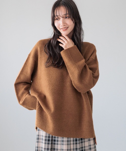 ■素材■ リサイクルポリエステルを使用したウール混で、ストレッチ性がありウール混の膨らみもあるやわらかな素材です。 着心地が良く普段使いにピッタリです。 ■デザイン■ 着やすいシンプルなデザインながらも両脇にスタイルアップ効果のあるタテ柄の編み組織をさりげなく施しました。 さらに両脇にスリットを入れて動きのあるシルエットに。 ■スタイリング■ 1枚で着用したり、タートルネックを出したりとレイヤードを楽しんでいただけます。 ボトムスはワイトパンヅでルーズに着用したり、シンプルにデニム合わせもおすすめです。