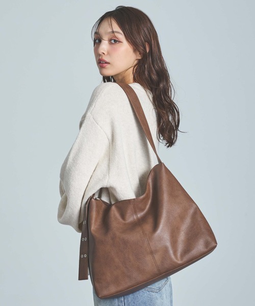 しなやかなフェイクレザーのショルダーバッグは大人上品な印象。 やわらかな素材がボディに馴染み、使い心地も抜群です。 A4サイズもすっきり収まる大きさで通勤通学から普段使いまでマルチに使えます。 ヴィンテージライクな素材と、ダブルバックルがポイントの コーディネートのアクセントになるショルダーバッグです。 ショルダーベルトはクール&スタイリッシュなアイレットデザインになっています。 ショルダーベルトは調節可能。 内側には便利な仕切りポケットが付いています。 ・A4サイズ可 ・裏地あり ・内ポケットあり ・ショルダー調節可 ・重量:約425g
