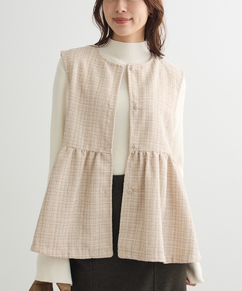 ほんのり煌めくラメツィード素材が目を惹くデザインベスト。ふわりと広がるペプラムシルエットがコーディネートにフェミニンな印象をプラスします。フロントはボタン仕様ですっきりと仕上げ、品のある1着に。デイリーからオフィスカジュアルまで幅広く合わせていいただけるアイテムです。透け感[なし]生地の厚さ[普通]光沢感[あり]伸縮性[なし]裏地[なし]ポケット[なし]※モデル着用画像は、光の当たり具合で色味が違って見える場合がございます。※お使いのモニター環境によって商品の色味が違って見える場合がございます。●Green Parks (fuuwa / topic / sara)●(グリーン パークス)20以上の人気ブランドを取り扱う、全国に約320店舗展開するアパレルセレクトショップ。ベーシックながらもさりげなくトレンドを取り入れたオリジナルブランドchocol raffine robeも展開。▼ 商品のお気に入り登録がおすすめです ▼商品ページ内のハートマークをクリック。完売時の再入荷や、最後の1点の通知、コーディネート画像がアップされたとき、お得なお値下げの際の通知を受ける事ができます。【お知らせ】ページでも通知が確認できます。