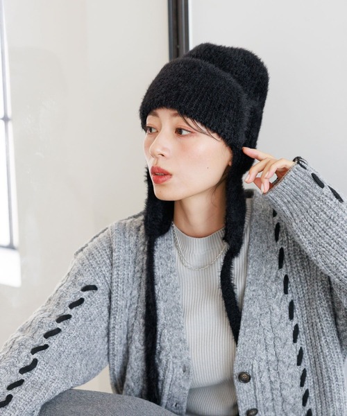 秋冬らしいスタイリングにぴったりなニット素材のフライトハット。 スタイリングに合わせやすい、ホワイトとブラックをご用意しました。 サイドの耳当てと紐がかわいらしく、防寒にも優れています。
