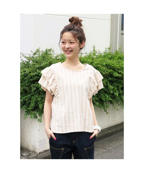 薄手のコットン・リネン素材を使用した半袖Tシャツ。ストライプ柄と袖部分のデザインがポイント。重ね着をしているようなバックデザインです。この製品は独特な風合いを出すため、製品洗いを行っております。1点ごとにサイズや風合い等、特徴が異なりますのでご了承ください。Torso:H163.5 B80 W58.5 H86 着用サイズ:01サイズ