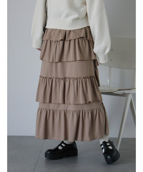 ランダムに配置されたティアードフリルが可愛いスカート。 スリット部分後ろはもちろんのこと、前にしたり横にしたりと着用する向きによって雰囲気も変わるアイテム。 ふわふわと揺れる沢山のフリルで、スタイリングも華やかな印象に演出してくれます。 ウエストは総ゴム仕様になっており、安心感のある穿き心地の良さも魅力的なポイント。 合わせるトップス次第で、カジュアルにもキレイめにもスタイリングが楽しめるアイテムです。 ※商品画像は、撮影環境やお客様のご利用のPC・スマートフォンのモニター環境などにより実物と色味に差異がある場合がございます。 【その他採寸】 F ウエスト:[ゴム仕様]66cm