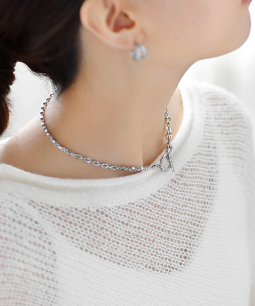 「ステンレス素材」のアクセサリーは、金属アレルギーや変色を起こしにくくデイリー使いにぴったりの優秀アイテム。 2種のチェーンが煌めき、スタイリッシュなデコルテに導くネックレス。 マンテル部分を前にするとアクセントになり、チェーン部分を前にするとシンプルに仕上がる2WAY仕様です。 単品使いはもちろん、お持ちのネックレスとの重ね付けもオススメ。 ※ATTENTION※ ■微細なキズや製造ムラはすべての商品に含まれます。 ■全ての方がアレルギーを起こさないという保証はできかねますので、万が一肌に合わない場合はご着用をお控えください。