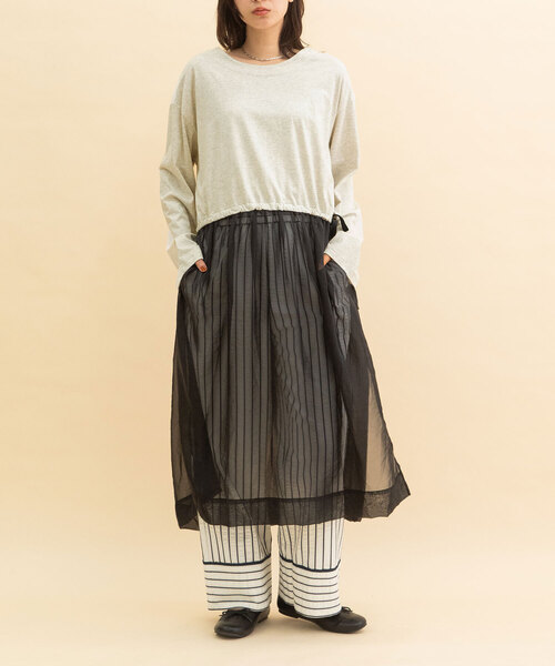 ■Pointカットソー素材とシアー感のあるオーガンジーをドッキングしたワンピース。首回りはクルーネックでスッキリとしたデザイン。ウエスト周りはゆったりと、リボンを通しているのでお好みのサイズ感で着用いただけます。■Styling大胆なサイドスリットが大人っぽく、柄のパンツやデニムパンツとのレイヤードを合わせると旬な着こなしができ、レイヤードスタイルをお楽しみいただけます。--------------------透け感:身頃部分なし/ボトム部分あり厚さ:身頃部分普通/ボトム部分薄手伸縮性:身頃部分ややあり/ボトム部分なし--------------------◆注意事項◆可能な限り実物に近いカラーにて掲載しておりますが、ご使用のパソコンやスマートフォンなどの端末の環境によって、実際の色味と異なって見える場合がございます。予めご了承ください。サンプルで撮影している商品もございます。その場合、実際の商品とは色味・仕様が異なる場合がございますので、予めご了承ください。POU DOU DOU プードゥドゥひと手間加えた存在感のある「日常着」いつまでもときめきとかわいいを忘れない方への愛着を持てるワードローブ= お気に入り登録がおすすめ!=お得な情報をいち早くお届け致します。アイテムをお気に入り⇒ SALE START / 完売COLOR再入荷 / LAST1点 etc...ブランドをお気に入り⇒新商品 / 再入荷 /クーポン・セール情報 etc...