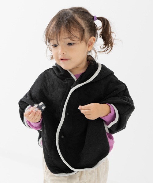 軽くて暖かいニットキルトのポンチョ!中綿が挟み込まれているのでふっくらとした生地感! 配色パイピングの縁取りがアクセントに! 車内やベビーカーでのお散歩など、さまざまなシーンで使えて便利!