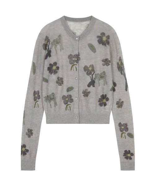 アニマルやフラワーモチーフが特徴のニットカーディガンです。モヘア調のふんわりとした柔らかな肌触りが、上品で優しい印象を演出します。すっきりとしたシルエットは、ボリューム感のあるワイドパンツやデニムとの相性も抜群です。5O8314800 #ニットカーディガン#ニット#モヘア#花柄