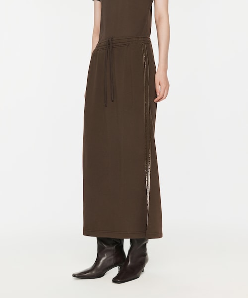 サイドにベロアリボンが施されたロングタイトスカートです。バックスリットが入っているので足裁きが良く、ジャージ素材を使用しているため、快適に着用できます。裏地はパイル地になっており、シーズンを問わず楽しめる一着です。 5O8D14750 #スウェットスカート#スカート