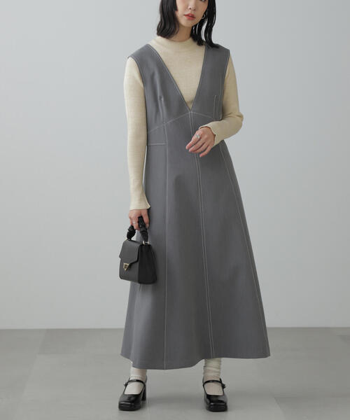 〔fabric&design〕しっかりめのツイル素材を使用し、配色ステッチでアクセントを効かせたメリハリ感のあるジャンスカです。深Vネックの襟元とバスト下の高めの切替えで、縦パネルラインを強調したでスッキリとした印象です。程よいAラインシルエットで、スタイルアップ見え。バックデザインには平ゴムでギャザーを寄せたバーを渡らせ、表情をプラスしました。脇あきファスナーでの着脱です。〔styling〕リブニットやロンTと合わせやすいデザインです。アームホールが深いので、ボリュームスリーブのニットなどのトップスもレイヤードしやすくなっています。■透け感:なし■生地の厚さ:普通■裏地:あり■伸縮性:なし■光沢:なし■シルエット:スタンダード---------------------------------------------------◆商品のお気に入り登録◆お気に入りアイテムの値下げ・再入荷・在庫1点などの通知を受け取ることができます。◆ブランドのお気に入り登録◆新商品や再入荷、セール、クーポン配布などお得な情報を受け取ることができます。---------------------------------------------------