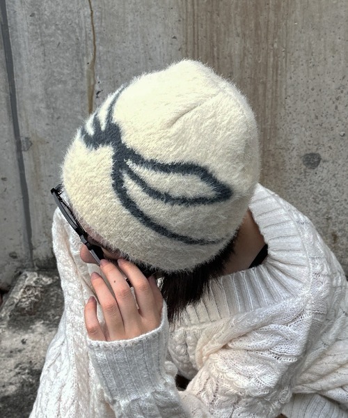 【jiasecond.】リボン柄シャギービーニー / 帽子 ニット帽 ビーニー ファー ニットワッチ リボン バレエコア シャギー 起毛 ふわふわ ブラック チャコール ZOZOTOWN限定