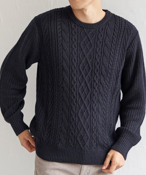 冬の定番ニットとして活躍してくれる、ケーブル編みのニットプルオーバー。身頃と袖の編地に変化を付け、表情豊かに仕上げました。【素材】リサイクル糸を使用したニット。【デザイン】メランジ見えする糸で編んだケーブルニット。サイズ感は着回しの効くレギュラーサイズです。【ikkaポイント】アラン柄をメランジ見えする糸で編み立てました。ペットボトルをリサイクルした、ポリエステル糸使用のエコ商品。抗菌防臭加工が施してあり、昨年から柄を大幅にリニューアルしています。[クリーニング]洗濯機洗い可(非常に弱く)、ウェットクリーニング(W)、洗濯の際はネットを使用してください