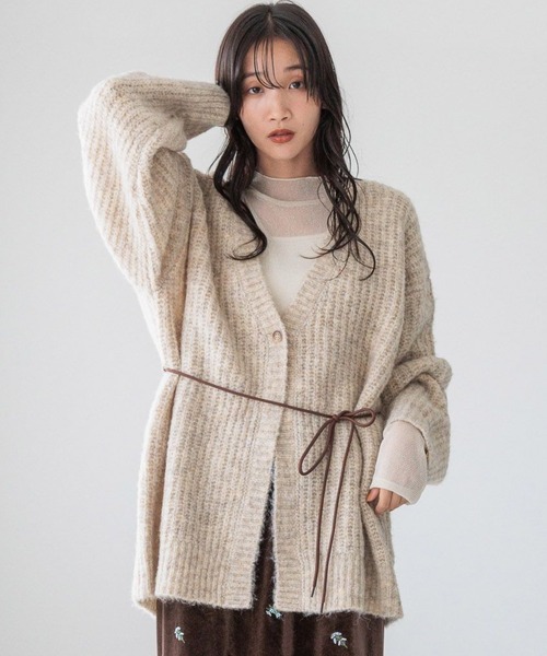 ■デザイン■ ウール混でふんわりとした秋冬らしいメランジカーディガン。 素材自体に厚みがあるのでアウター代わりにもなる優れもの。 顔周りをすっきりと見せてくれるVネックとリラックス感あふれるドロップショルダーで気になる部分をカバー。 配色の別紐でウエストマークすればカシュクールトップスとしても着用可能になっています。 ■スタイリング■ ボリュームのあるシルエットなので、ボトムはタイトスカートやショートパンツなどすっきりとしたボトムと相性良く着用いただけます。 インナー次第で雰囲気を変えて着用できるのでその日の気分で雰囲気を変えて着用いただけるアイテムです。