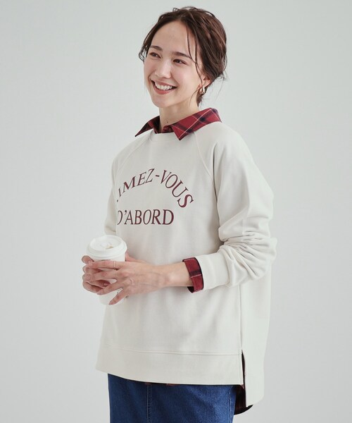 【デザイン】肩から二の腕のラインをきれいにカバーしてくれるラグランスリーブのスウェット。ゆとりのあるサイズ感で体型カバーにもおすすめです。裾は前後差があり、サイドスリット入りなのでコーデのバランスが取りやすくなっています。シンプルで大人カジュアルなロゴプリントがデイリーユースにぴったりです。【プリント訳】オフホワイト(003カラー)、チャコールグレー(013カラー) ・・・Aimez-vous d’abord:まず自分を愛すことからグレー(012カラー)、モカブラウン(042カラー) ・・・N. Mex.:ニューメキシコ州【スタイリング】イージーパンツなどと合わせてラフなスタイリングと好相性。ロンTをレイヤードし、柄のスカートと合わせればこなれ感ある着こなしもお楽しみいただけます。骨格ナチュラルの方に特におすすめの一枚です。【素材】綿混の裏毛素材を使用しています。※照明の関係により、実際よりも色味が違って見える場合があります。また、パソコン・スマートフォンなどの環境により、若干製品と画像のカラーが異なる場合もございます。モデル情報:身長163cm B81 W59 H88 着用サイズ:02(M)店舗へのお問い合わせ商品番号:C62-19053●製品寸法:01(S):着丈64cm B102cm 裄丈73cm02(M):着丈66cm B105cm 裄丈74cm03(L):着丈68cm B108cm 裄丈75cm04(LL):着丈70cm B112cm 裄丈77cm備考: