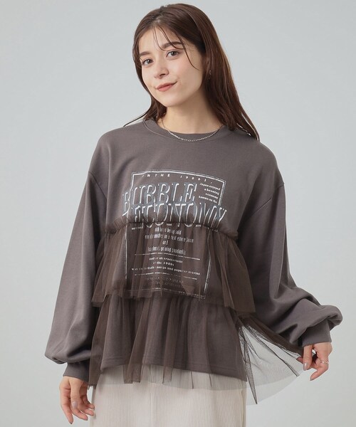 【デザイン】人気のロゴスウェットに、トレンドのチュールをドッキング。一枚で華やかになるデザインです。ロゴのカジュアル×チュールの上品さが、スタイリングの良いアクセントになります。【スタイリング】チュールのデザインがポイントなのでアウトスタイルでの着こなしがおすすめ。デニムで合わせるカジュアルスタイルや、ナロースカートを合わせてきれいめに合わせるスタイルなど幅広い着こなしが叶います。上からアウターを羽織っても、チュールとロゴのデザインが除いてこなれ見えしてくれます。【素材】秋~春まで長く着られる裏毛素材です。やわらかい風合いです。※照明の関係により、実際よりも色味が違って見える場合があります。また、パソコン・スマートフォンなどの環境により、若干製品と画像のカラーが異なる場合もございます。#CutieBlonde#Cutie#cutieblonde#cutie#キューティブロンド#キューティモデル情報:身長164cm B78 W56 H80 着用サイズ:02(M)店舗へのお問い合わせ商品番号:256-19052●製品寸法:01(S):着丈61cm B100cm 袖丈50cm 肩幅48cm02(M):着丈62cm B105cm 袖丈50cm 肩幅50cm03(L):着丈63cm B110cm 袖丈50cm 肩幅53cm04(LL):着丈64cm B116cm 袖丈50cm 肩幅56m備考: