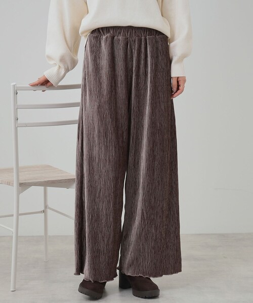 【デザイン】ランダムプリーツがポイントのベロア調イージーパンツ。ジャージ素材で伸縮性があり、ウエストはゴム仕様なので、楽ちんな着心地です。オーバーサイズのトップスに合わせたリラックスカジュアルスタイルがおすすめです。【スタイリング】シンプルなトップスやロゴ、大柄のニットと好相性。着丈も長めなので、ゆるっとしたトップスを合わせ、ゆるずるっとしたコーデはバランスよく決まります。身体のラインを拾いにくいので、体型カバーにもおすすめです。【お客様からいただいたコメント】・産後の体型カバーができて良いです。 Lサイズでも丈が長すぎることなく穿けました。 穿きやすく合わせやすいのでよく穿いています。 気に入ったので3色買いました。 (身長:156cm 体型:ふっくら アイボリーのLサイズ購入) とのお声を頂戴しております。【素材】光沢感のあるクラッシュベロア調のジャージ素材。伸縮性があり、落ち感もあるのでシルエットがすっきり見える効果も。【仕様】・ポケット数:横×2・ウエスト総ゴム・裏地なし※アイボリー(004)はやや透け感があるため、インナーの着用をおすすめします。※照明の関係により、実際よりも色味が違って見える場合があります。また、パソコン・スマートフォンなどの環境により、若干製品と画像のカラーが異なる場合もございます。#CutieBlonde#Cutie#cutieblonde#cutie#キューティブロンド#キューティモデル情報:身長164cm B78 W56 H80 着用サイズ:02(M)店舗へのお問い合わせ商品番号:256-69009●製品寸法:01(S):W62~72cm H92cm 股下62cm 前股上33cm 渡り幅31cm 裾幅30cm02(M):W64~74cm H94cm 股下64cm 前股上34cm 渡り幅31cm 裾幅30cm03(L):W67~77cm H97cm 股下66m 前股上35cm 渡り幅32cm 裾幅31cm04(LL):W70~80cm H100cm 股下69cm 前股上36cm 渡り幅33cm 裾幅31cm備考: