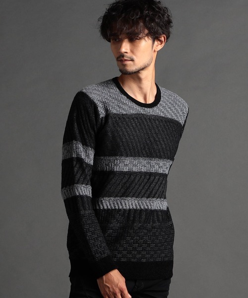 ■デザイン柄と色をランダムに組み合わせたボーダー柄のクルーネックニット。肌触りの良いウォーム感とストレッチ性のあるニットで、スッキリとタイトなシルエットに仕上げています。インナーとして1枚で決まるインパクトのあるアイテムです。■サイズ身体にフィットするややタイトめなサイズ感ながら、伸縮性に優れている為 ストレスフリーな着心地です。■素材ランダムリブ、幾何学、ケーブル、バイヤス柄を斜めに組み合わせ、色をボーダー状で分けている複雑な柄をリンクス編みで表現しています。さりげない光沢感のあるシャギー糸とストレッチ性のあるレーヨン糸を組み合わせて編んでいるので奥行きのある深みのある編地になっています。※07ボルドーは、ボルドー・ブラック・グレーからボーダー毎に2色を引き揃えた杢カラーになります。09ホワイトは、ホワイト・ライトグレー・チャコールからボーダー毎に2色を引き揃えた杢カラーになります。49ブラックは、ブラック・チャコール・グレーからボーダー毎に2色を引き揃えた杢カラーになります。伸縮性:あり生地の厚さ:普通■注意点モール糸は糸自身が太く組織も粗くなる為、糸が浮いたり引掛けたりすることがありますので、取扱いには次の点に十分ご注意下さい。着用時、ベルト・バッグや周囲の壁などとの摩擦や引掛りにご注意下さい。クリーニングの際は、クリーニング店へモール糸の為、他の商品との引掛りに注意して頂く様、ご提示下さい。万一、糸が浮き出た時はその部分を中央にして両手で生地をタテ、ヨコ斜めに引っぱり、出た糸を少しずつ引っ込めるか、裏側に引っぱり出して下さい。