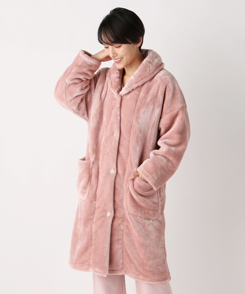 毛足の長いエコファーを使用したガウンです。ふっくらやわらかなエコファーを贅沢にあしらい、シンプルなデザインに仕上げました。幅広いインナーやルームウエアに合わせやすいので、ご自分用にはもちろん、ギフトにもぴったりなアイテム。お風呂上りやお休み前の読書タイムなど、寒い時期に羽織るだけで体の冷えを防いでくれます。両面起毛の素材を使用し、包み込まれるようなあたたかさと軽い着心地を実現。フロントの両サイドにはパッチポケットが付いているので、ヘアクリップなどちょっとした物を入れておきたいときにも便利です。ご家庭の洗濯機洗いに対応しており、お手入れも楽々行えます。 *洗濯前のつけ置きや濡れたままで長時間放置しないでください。 *洗濯の際はネットを使用してください。