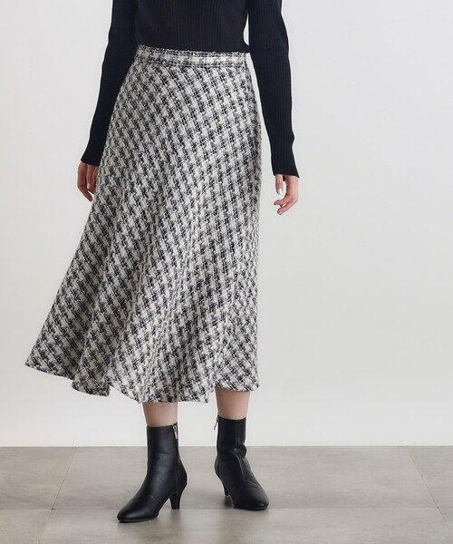 クラシカルな表情ある素材感で魅せるフェミニンフレアースカート 【デザイン】 腰回りすっきりと穿ける綺麗なシルエットのフレアースカートです。 意匠感のある素材でお作りしているので、シンプルなフレアースカートでも1枚で存在感ある見栄えになります。 膝下丈のクラシカルムードあるフレアースカートは、冬のフェミニンスタイルに外せないアイテムの1つとしておススメです。 ウエスト後ろ中心部分にはゴムを入れて可動性を持たせているので、ウエスト周りも楽な穿き心地です。 ※ポケットなし 【素材】 ループ糸を使用してざっくり織った表情ある柄が特徴です。 フェミニンなチェック柄とマニッシュなヘリンボーン柄の全く違ったテイストの柄をアソートしていますで、お好みのスタイルに合わせて選んでいただけます。 ※裏地あり ※裏地のない部分はやや透け感があります。 【スタイリング】 シンプルなリブのニットプルオーバーやブラウスと合わせて大人クラシカルな雰囲気で着用いただけます。 お仕事からちょっとしたイベント等のおでかけまで、幅広いシーンで活用いただけます。 丈の短いアウターと相性が良いです。 ロングコートを合わせても重た過ぎない丈設定になっていますので、バランスよく決まります。 ※照明の関係により、実際よりも色味が違って見える場合があります。また、パソコン・スマートフォンなどの環境により、若干製品と画像のカラーが異なる場合もございます。 【24AW】 モデル情報:身長166cm B80 W59 H86 着用サイズ:02(M) 店舗へのお問い合わせ商品番号:768-79057 ●製品寸法: 01(S):W64~76cm H120cm 総丈71cm 02(M):W67~79cm H123cm 総丈73cm 03(L):W70~82cm H126cm 総丈75cm 04(LL):W73~85cm H129cm 総丈77cm 05(3L):W76~88cm H132cm 総丈77cm 備考: