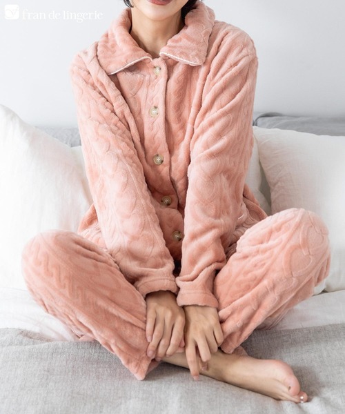-- ふんわり軽くて暖かいmemory fleece (メモリーフリース) -- 軽くて暖かい、ふんわりフリースはリラックスタイムの防寒にぴったり。カラーやデザインが豊富なフランデランジェリーの人気の冬のあったかパジャマmemory fleece (メモリーフリース)シリーズです。 -- ベーシックなパジャマデザイン -- フロントがボタンで全開できるベーシックなパジャマタイプの上下セット。襟があるので冷えやすく首周りをしっかり温めたい方にもおすすめです。トップスにはスマホもすっぽり収まる便利なポケット付。 ◆商品名:memory fleece (メモリーフリース 全開上下セット) ◆サイズ展開: M-L ◆素材構成 : ポリエステル 100% ◆商品特徴 : ふんわり軽くて暖かいmemory fleece (メモリーフリース) ≪企画:日本 生産:中国≫ [サイズ: M-L] ---------------------- 着丈cm(前/後ろ): 68 肩幅cm: 45 身幅cm: 55 そで丈cm: 55 股上cm(前/後ろ): 32/37 股下cm: 64 すそ周りcm: 36 もも周りcm: 60 ウエストcm: 62~110 ヒップcm: 104