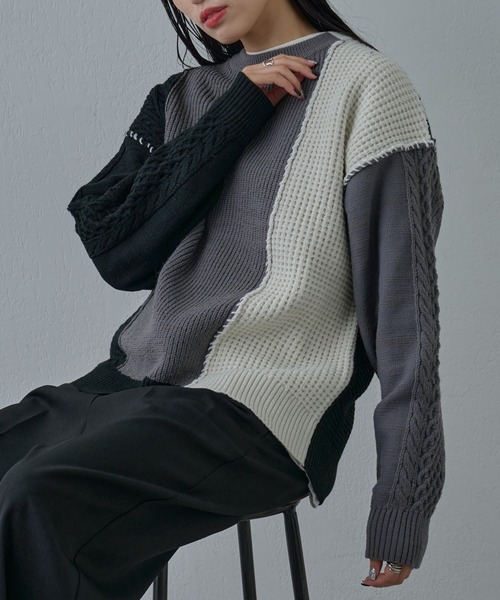 【太めのステッチと異素材ドッキングで存在感抜群ニット】太目なステッチデザインと異素材をドッキングしたインパクトのあるニットです。軽くて柔らかく着心地の良いニットになっております。ゆとりのあるサイズ感で今季らしい着こなしが可能で、1枚着でもインナーとしてもコーデの主役になる万能アイテムです。【商品ポイント】・目を引く配色・太めなステッチと異素材を組み合わせたデザイン・トレンドなビッグシルエット----------------------------------------------------■商品特徴洗濯方法:手洗い可裏地:なし透け感:なし伸縮性:あり光沢感:なし生地の厚さ:普通----------------------------------------------------■素材アクリル53%,ポリエステル47%----------------------------------------------------※着用、お取り扱いの際は、商品についている品質表示とアテンションタグを必ずご確認下さい。※商品タグに記載されている商品名がWEBでの表記名と異なる場合があります。※画像の商品はサンプルです。実際の商品と仕様、加工、サイズが若干異なる場合がございます。 ※照明の関係により、実際よりもやや明るく見える場合がございます。またパソコンなどの環境により、若干製品と画像のカラーが異なる場合もございます。予めご了承くださいませ。【お気に入り登録】してお得な情報をCHECK!!・「商品のお気に入り登録」で再入荷通知や、ラストの通知、セール通知も受け取ることができます。・「ブランドのお気に入り登録」で新商品や再入荷など、お得な情報を受け取ることができます。