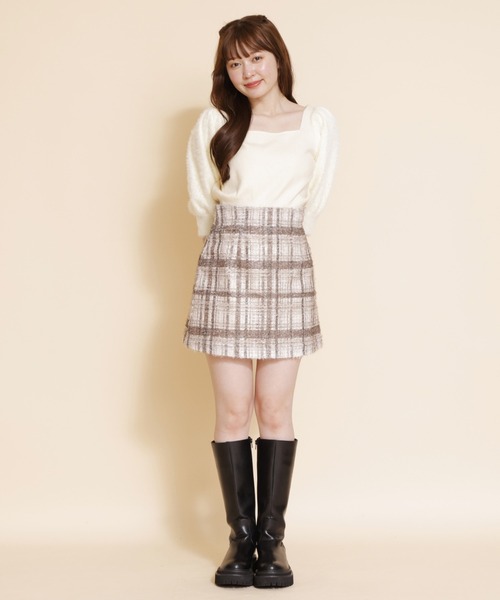 光に当たるとキラっと輝くファンシーチェックのミニスカートトレンドのファンシーな糸使いが特徴的な先染めチェック生地を使用しました。立体感のある素材感で、コーディネートの主役になるアイテムです。光を反射する糸が混ざっているため、光に当たるとキラキラします。【styling】ふわふわのシャギーニットと合わせれば、可愛くて上品なガーリースタイリングが完成!ブラウスやリブニットトップスなどで合わせればきれいめコーディネートに。--------------------------透け感:ややあり裏地:あり伸縮性:なし生地の厚さ:やや薄手---------------------------S:(01):スカート丈44cm ウエスト71cm ヒップ99.5cmM:(02):スカート丈46cm ウエスト75cm ヒップ103.5cm