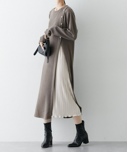 ■デザイン・人気商品がLL~6Lサイズを追加して再入荷しました!!・秋・冬・春までロングシーズン着られるワンピース。・パール調ボタンをポイントに、プリーツをドッキングした1枚でサマになるデザインです。・リブの縦ラインで細見え効果も期待できます♪■素材雰囲気のあるニットのようなカットソー、ニットソー素材をセレクト。■おすすめのスタイリング春にはショートブーツやスニーカーでカジュアルダウンさせたスタイリングもおすすめです◎【Be praised】ーーー明日ちょっと褒められる服ーーー大人トレンドを意識したこだわりのアイテムと着こなしでアナタの毎日に輝きを。ただシンプルできれいなだけじゃ物足りない。カジュアルすぎず、スタイリッシュで大人の品性を感じる着こなしに。そんな、こなれたオシャレを楽しむ女性に寄り添う、 新鮮なリアルクローズをご提案します。<品質>品質:[本体]ポリエステル97%・ポリウレタン3%(カットソー)[配色部分]ポリエステル100%(織物)※こちらの素材はニットの風合いを持つソフトなデリケート素材を使用しておりますため、突起物などに擦れますとひっかける恐れがございますので、十分にご注意ください。透け感:なし生地の厚み:普通季節:春・秋・冬シルエット:普通<洗濯方法>手洗い■キーワード冬、秋、通勤カジュアル、オフィスカジュアル、大人カジュアル、大人、きれいめカジュアル、きれかじ、キレカジ、20代、30代、40代、ロングワンピース、きれいめ、プリーツ、スカート、デートコーデ、お出かけコーデ、ロングシーズン、パールボタン、クルーネック、ドッキング、異素材、洗える、洗濯OK、