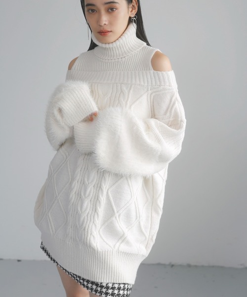 人気のミニワンピースをアップデート!女性らしさを兼ね備えた1枚完成ワンピース◆2024-25冬◆ 【デザイン・シルエット】 肩がちらっと見えるオフショル風ハイネックニットケーブルミニワンピース。 去年も大人気で今年はケーブルと袖にフェザー編み込みをしてグレードアップしました! <POINT> ・小顔見えのハイネックデザイン ・オフショル風なのでアウターも着やすいワンピース ・オリジナルケーブル柄 ・袖だけフェザーを編み込んで凹凸感プラス ・短すぎず長すぎない足がきれいに見えるミニ丈 【素材】 程よい肉厚感のあるニット。袖周りは毛足のあるフェザー編みのため、温かみをさらに感じていただけます。 【カラー】 ミルクのようなホワイトと少しの赤味を感じるチョコブラウン、去年も大人気のレッドの3色展開。 【おすすめのスタイリング】 1枚で映えるモテワンピース。身長にあわせてショート・ハーフパンツ合わせも可愛い! ロングブーツはもちろん、デニムやスラックスと合わせてカジュアルダウンもおすすめです。 ----------------------------- 裏地:なし 光沢感:なし 透け感:なし 伸縮性:あり 生地の厚さ:やや厚手 季節:秋、冬 ----------------------------- 【モデル着用サイズ】 全色モデル身長:168cm、着用サイズ:F ※画像の商品はサンプルです。 実際の商品と仕様、加工、サイズが若干異なる場合がございます。 ※画像によっては実際の色味と異なる場合があります。正しい色味は生地アップ画像をご確認ください。