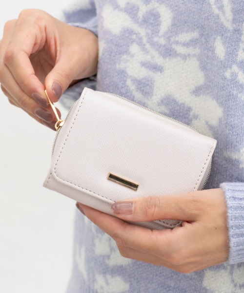 人気の小さめサイズ 【デザイン】 持ち歩きやすいコンパクトフォルムの三つ折りタイプ。 ゴールドプレートが高見えのアクセント。 【素材・機能】 上品なフェイクレザー素材。 前と後ろで小銭とお札を分けて収納可能。 仕切り付きで取り出しやすい小銭入れは、安心のファスナー開閉。 【スタイル】 デイリー使いはもちろん、フォーマルシーンの小さめバッグ用としても活躍。 ※湿度・摩擦により多少色落ちする可能性があります。 品番:277-121-8990