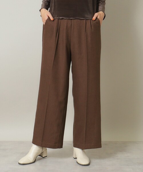 【デザイン】 立体的なシルエットの2タックワイドパンツ。 着回し力の上がるベーシックなアイテムです。 ウール調のツイル素材を使用した、秋冬らしいほんのり温かみのある素材感。 微光沢感のあるツイル素材がきれい見えするデザインです。 フロントにタックを2本入れた立体的なシルエット。 ヒップ部分は間延びしない様にフェイクポケットをあしらいポイントを付けました。 後ウエストはゴム仕様なので着脱がし易く、サイズカバー力もあります。 【素材】 ウール調のポリエステルツイル素材。 【仕様】 ・ポケット数:横×2 後ろ(ダミー)×2 ・ウエスト後ろゴム ・裏地あり ※照明の関係により、実際よりも色味が違って見える場合があります。また、パソコン・スマートフォンなどの環境により、若干製品と画像のカラーが異なる場合もございます。 モデル情報:身長171cm B80 W59 H88 着用サイズ:00(フリーサイズ) 店舗へのお問い合わせ商品番号:P93-69005 ●製品寸法: 00(フリーサイズ):W64~70cm H102cm 股下67cm 前股上32cm 渡り幅35cm 裾幅28cm 備考: