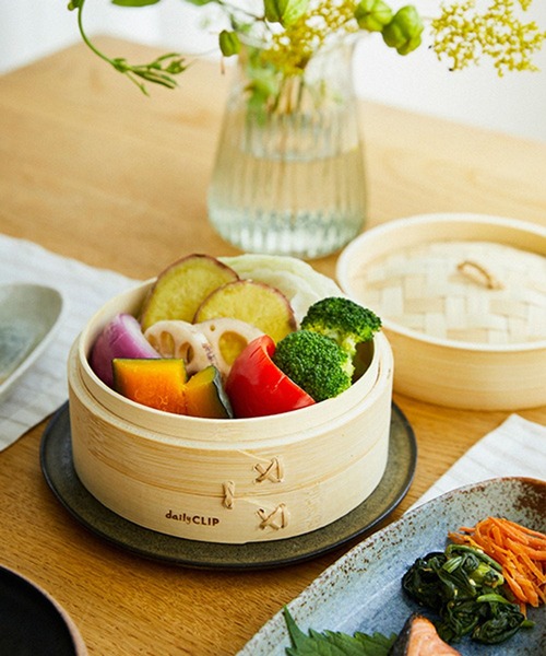 daily CLIPオリジナルせいろ 蒸気でじっくり火を通すことで、素材をふわりとやさしい味に仕上げる「せいろ」。 側面にdailyCLIPの焼き印を入れてオリジナル仕様にしました。 1人分の料理をするのにちょうど良い直径15cmです。 【特徴】 ・蒸し器は冷めると水蒸気が水滴となって食材に降り注いでしまうのに対し、せいろは素材の特性上、蒸気をコントロールできるので水滴が落ちることなく食材が冷めてもおいしく食べられるのが魅力 ・木を素材に採用しているので、余計な水分を吸い取るので料理しやすいです ・素材である竹は木の香りが食品に移らないので、食材そのものの風味を損ないません ・耐久性があり、抗菌性や調湿性が高いです