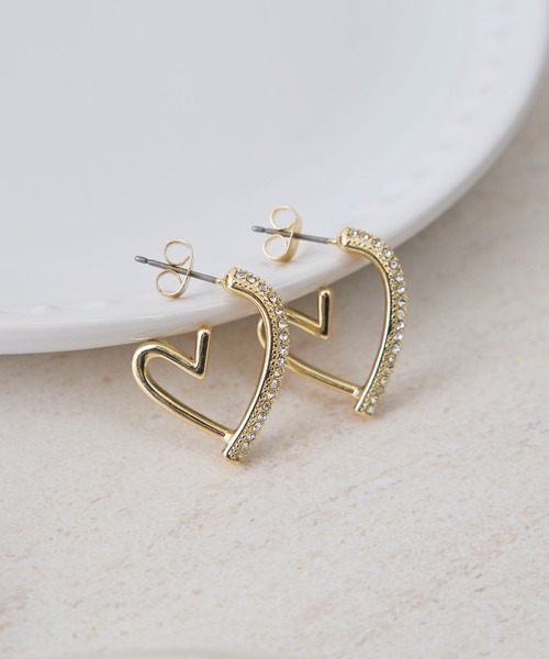 ハートの愛らしさをほどよく大人っぽくしたピアス。【デザイン・シルエット】・メタルフープピアスをハート型にアレンジ。・フロントは小粒のビジューを並べて華やかに演出。・サイドからのルックが印象的な一品。【カラー】・ゴールド、シルバーの2色展開。【スタイリングポイント】・ヘアスタイルはすっきり纏めると、ピアスが目立つのでおすすめ。・ホリデーシーズンの華やかな装いにも映えるゴージャスさ。※撮影時の光、お使いのモニター環境によって色の見え方が違う場合がございます。